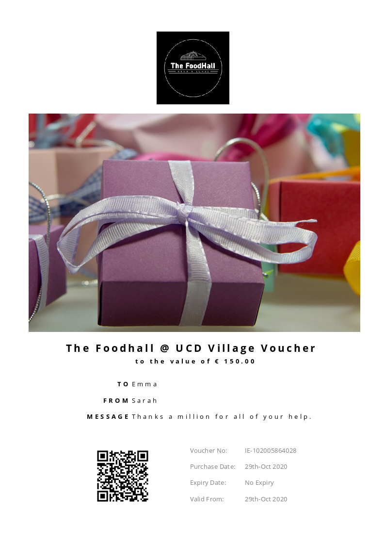The Foodhall @ UCD Village allows you to purchase instantly printable gift vouchers, special offers and tickets using the Voucher Connect platform.